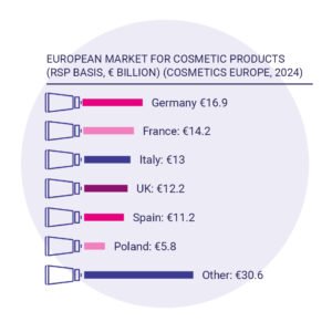 Europe is a flagship market for cosmetics and personal care products, with retail sales valued at €104 billion in 2024.